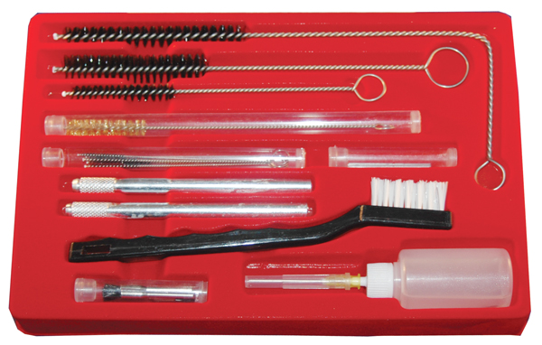 This kit contains a variety of brushes and picks which can be used to remove paint from spray guns and cups