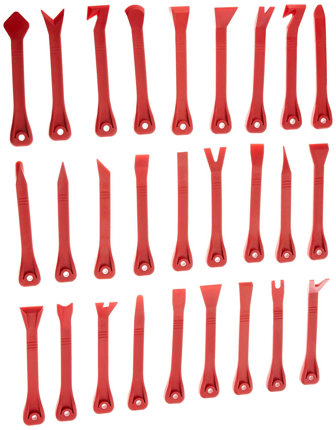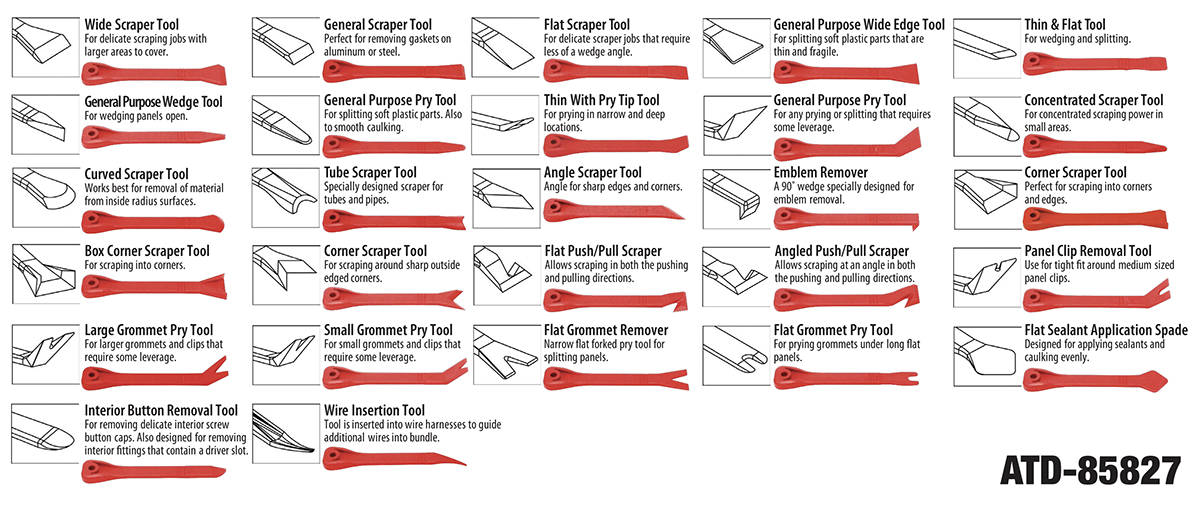 Designed for safe removal of door panels, fascia and trim strips, window moldings, dashboard and interior panels & trim, etc.